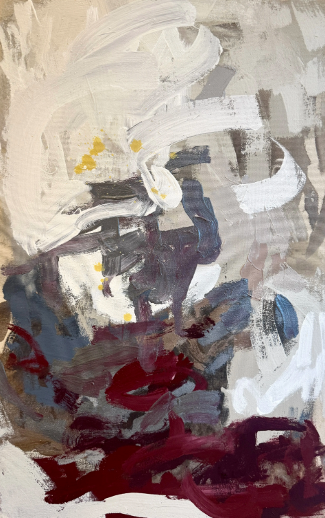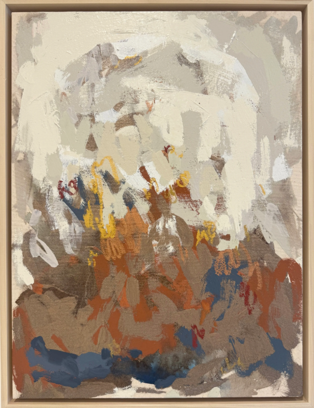 Erin’s paintings are unmistakable—soft yet bold, abstract yet grounded in feeling. She paints exclusively on raw, unprimed canvas, beginning each piece by pouring watered-down acrylics directly onto the fabric. Once the washes dry, she adds texture and structure using palette knives, oil pastels, and instinct.