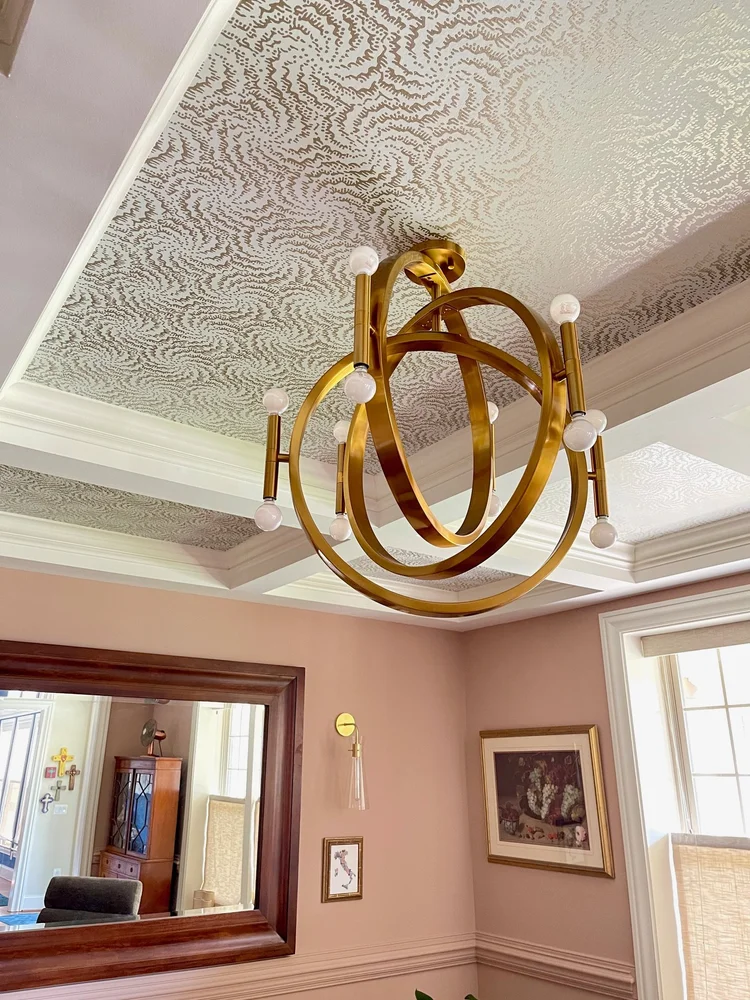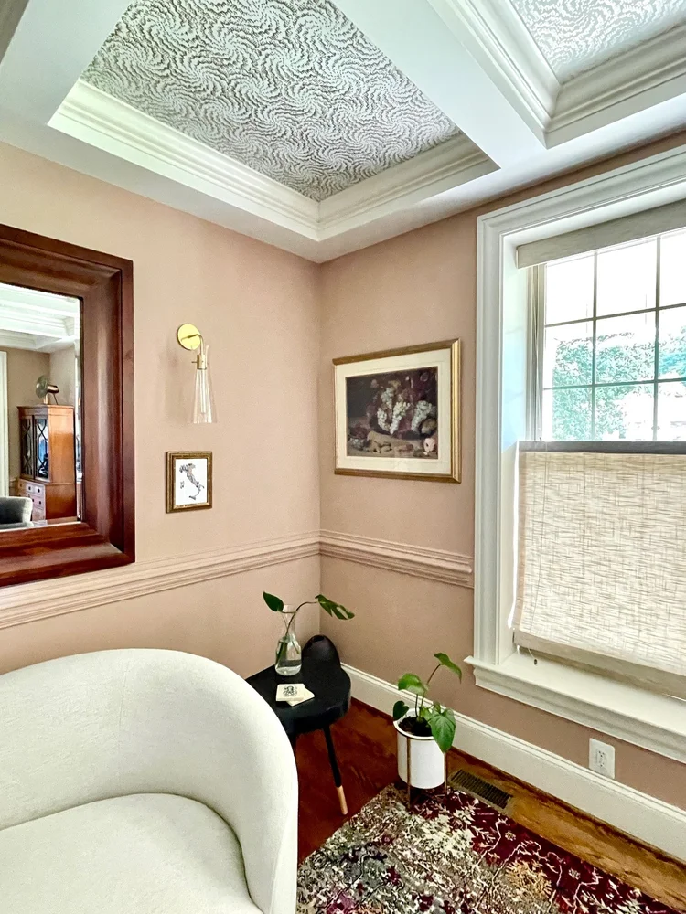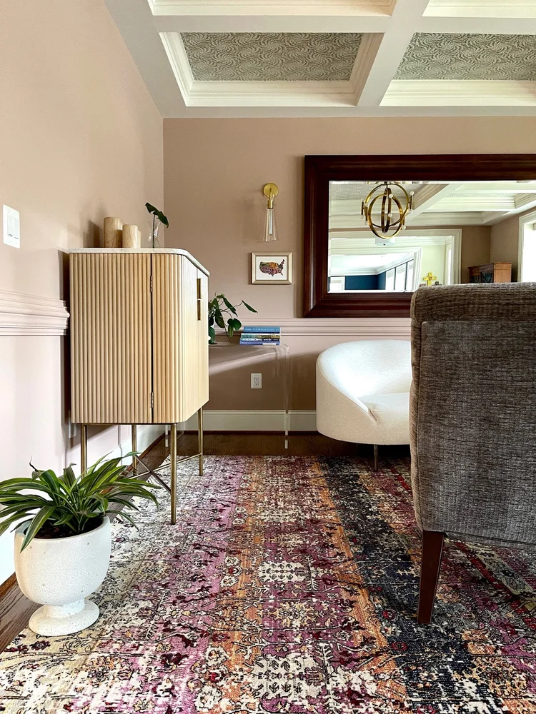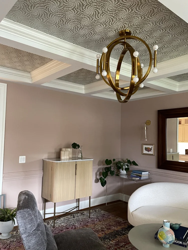 We wrapped the walls in a warm yet sophisticated blush and layered the ceiling with a luminous golden wallpaper, crowned by a statement chandelier. The goal was fun, feminine sophistication-and every detail supports that vision. Soft, curved furnishings invite conversation, while a vibrant, colorful rug brings energy underfoot. Eclectic bar pieces and side tables add personality, and lush greenery keeps the space feeling fresh and alive.