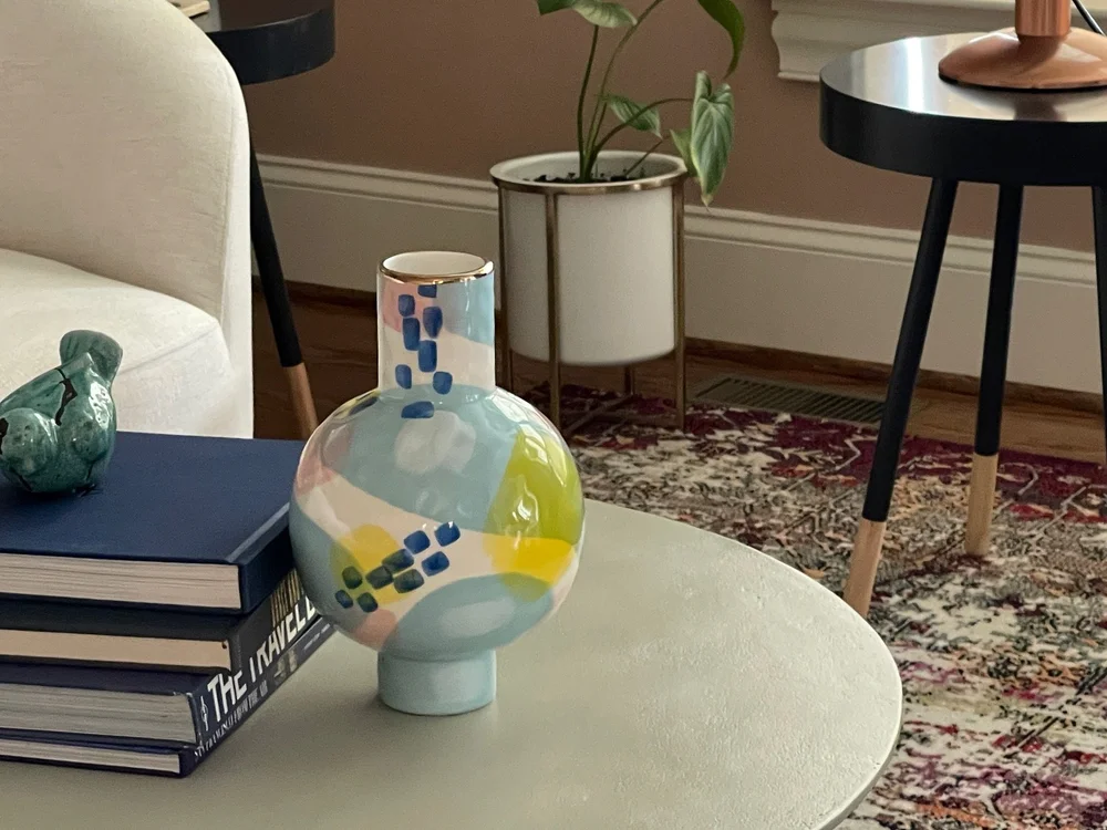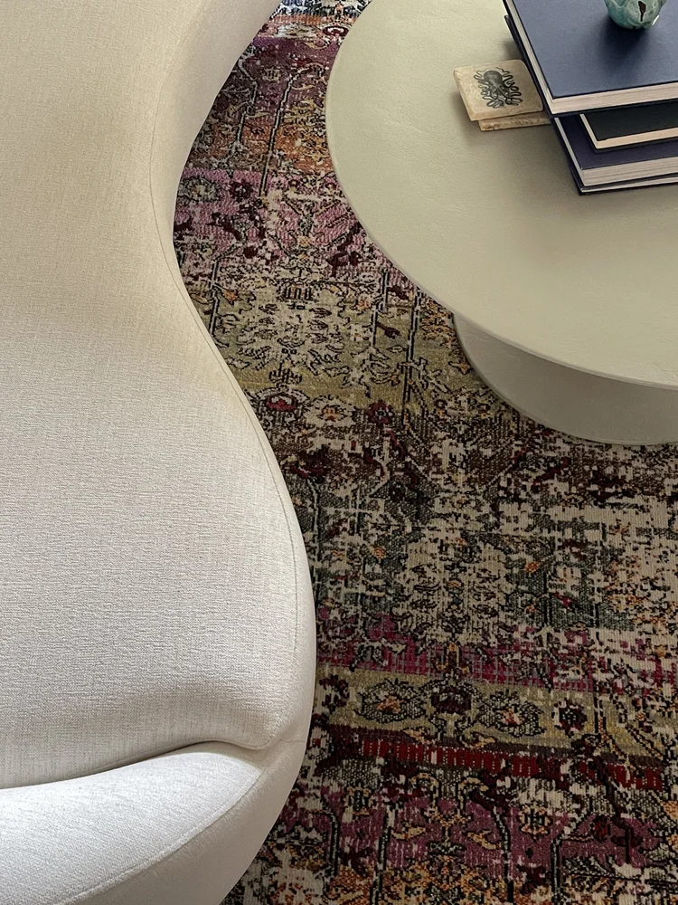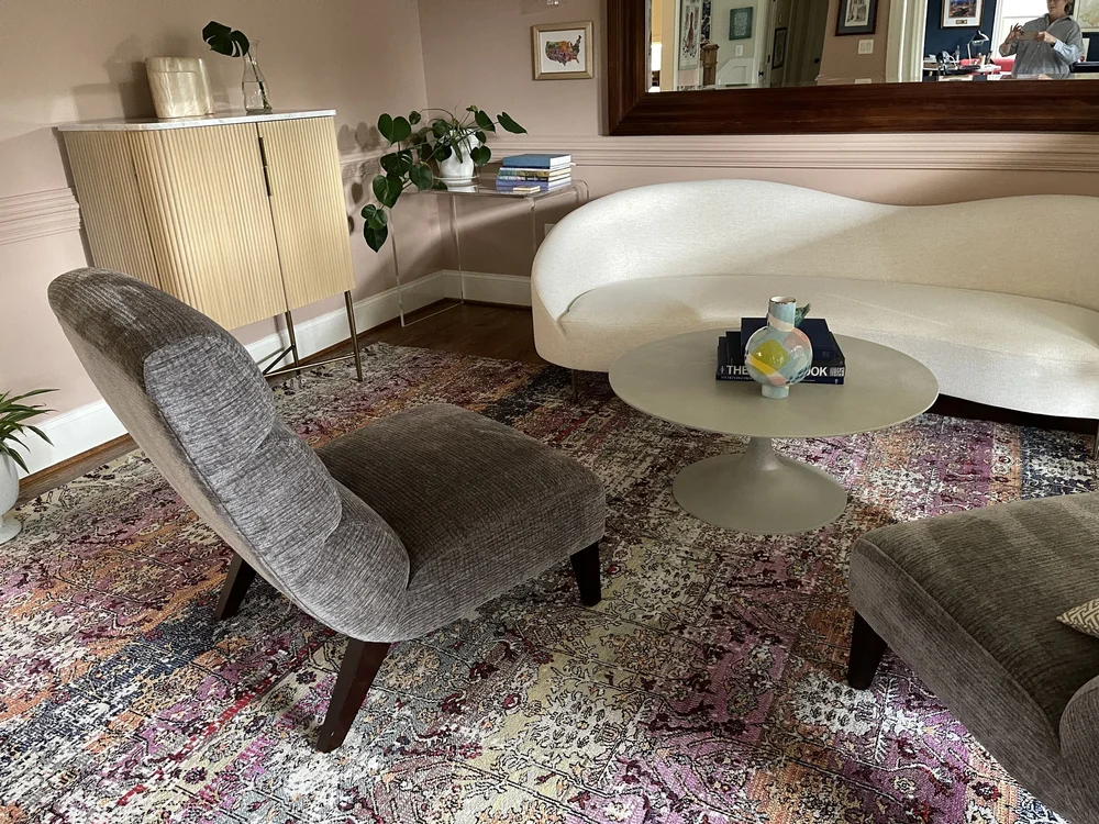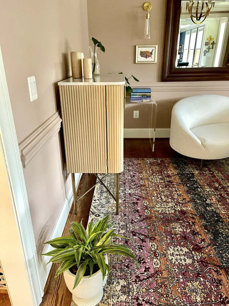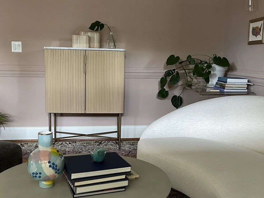 We wrapped the walls in a warm yet sophisticated blush and layered the ceiling with a luminous golden wallpaper, crowned by a statement chandelier. The goal was fun, feminine sophistication-and every detail supports that vision. Soft, curved furnishings invite conversation, while a vibrant, colorful rug brings energy underfoot. Eclectic bar pieces and side tables add personality, and lush greenery keeps the space feeling fresh and alive.