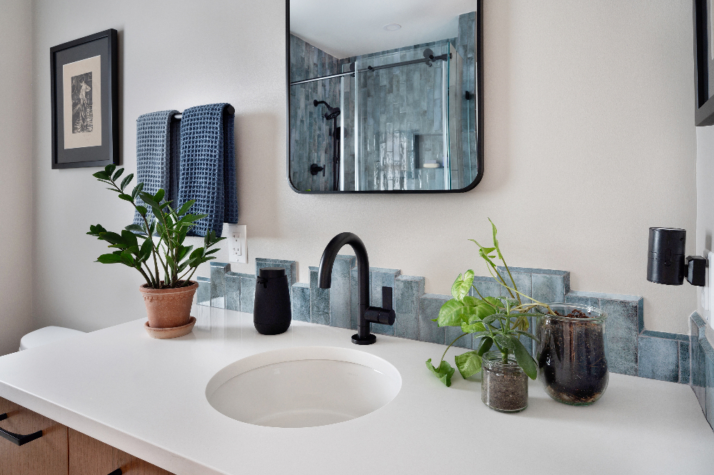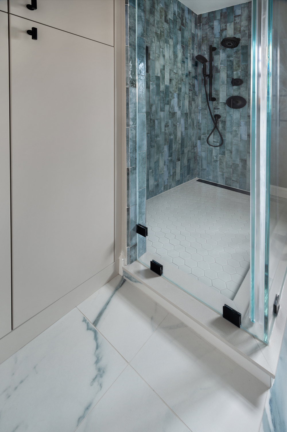 We reimagined the space with my client’s favorite color-blue-as the star. Soothing, water-inspired tile brings a calm, inviting energy, while a rich walnut floating vanity grounds the palette with warmth. To solve the storage dilemma, we designed custom shelving tucked neatly into the wall, creating function without sacrificing style.