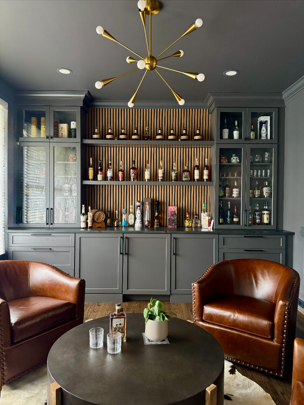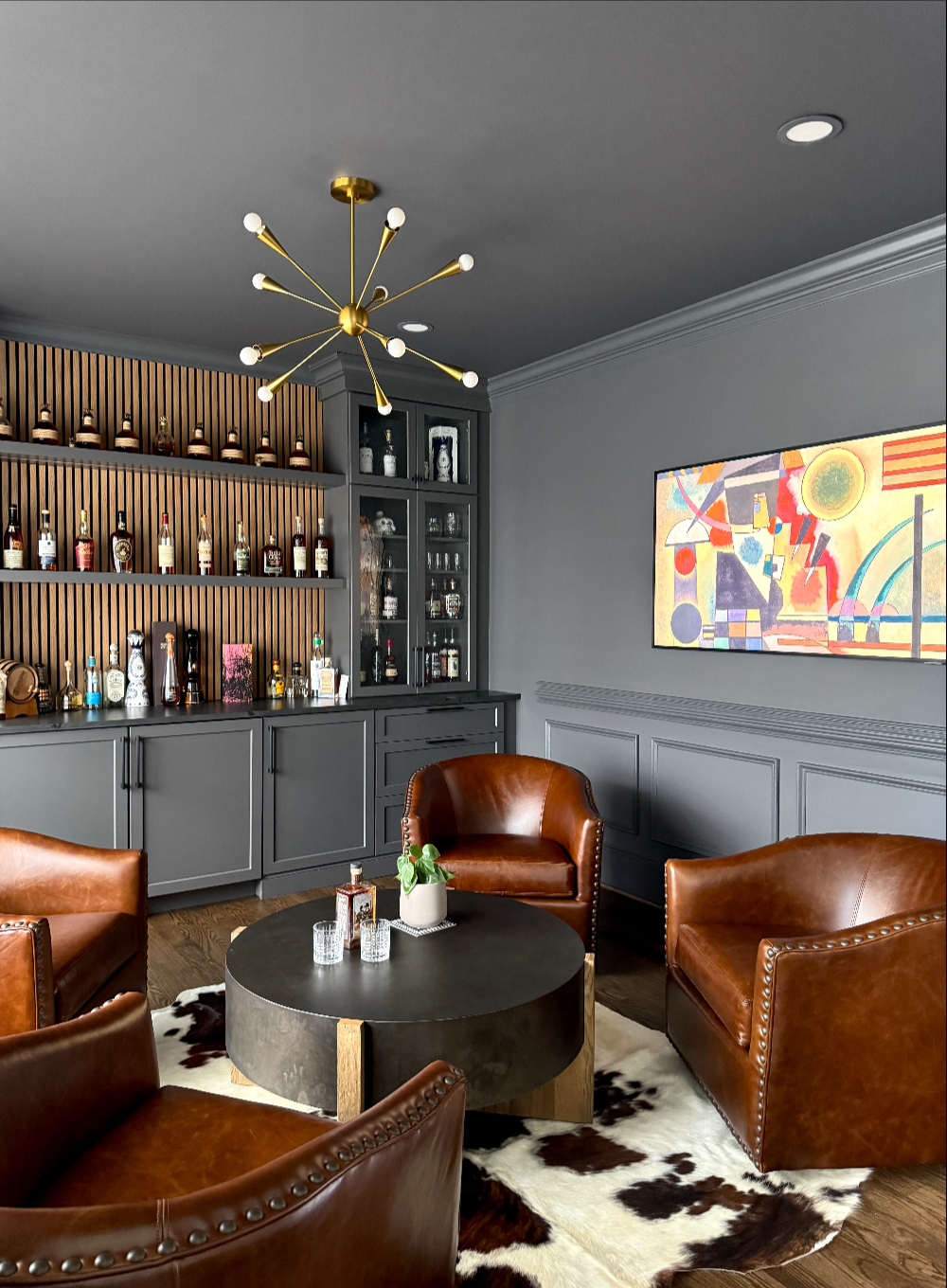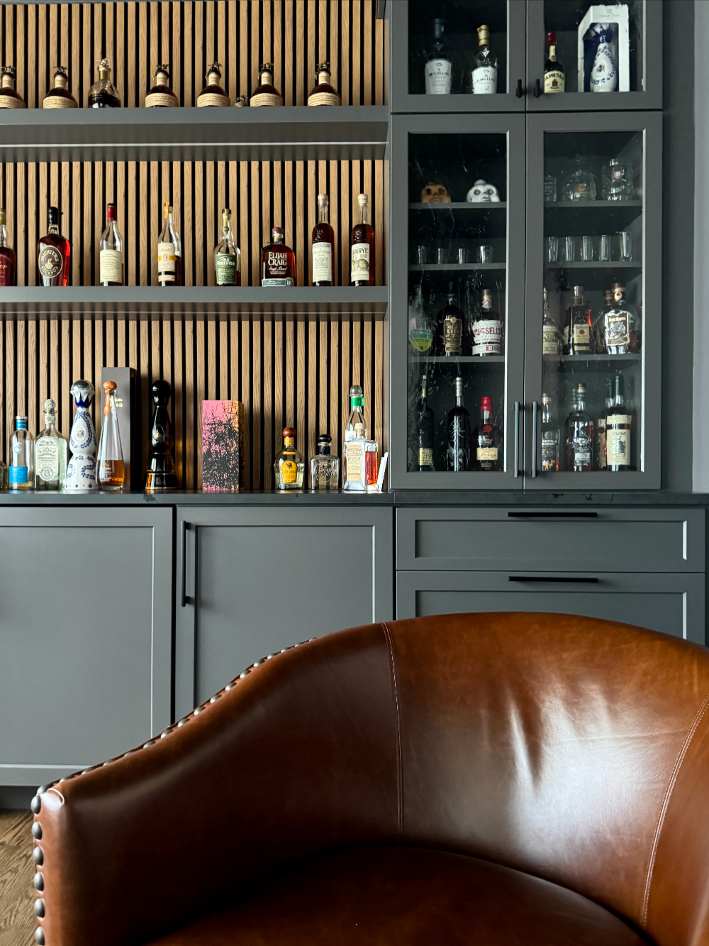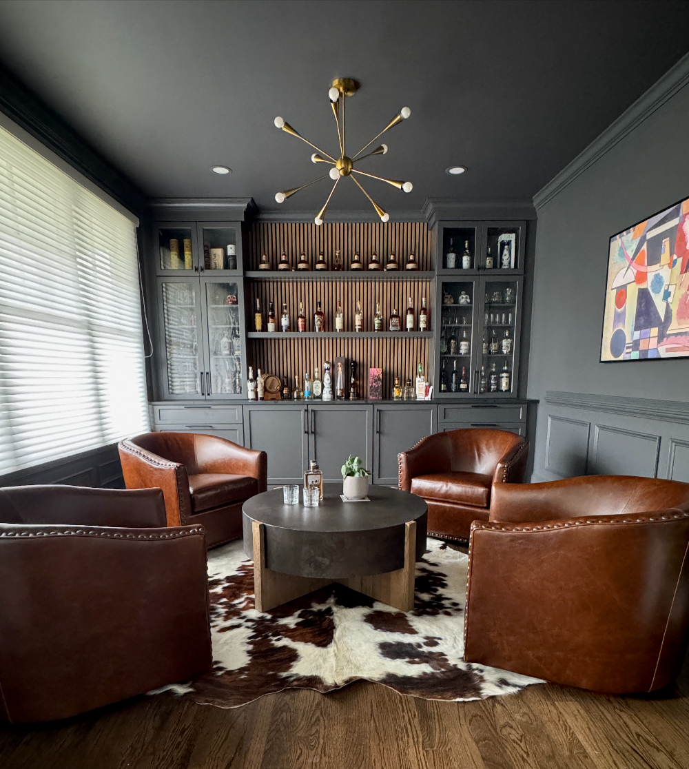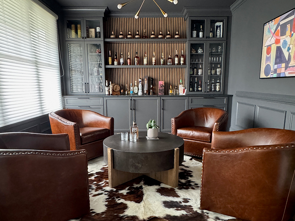 The answer is this dark and moody bourbon tasting lounge, designed as the ultimate escape. We transformed an unused room into a sophisticated, yet inviting sanctuary dedicated entirely to the bourbon experience. Custom bar shelving was installed to perfectly display the collection while maintaining an organized and curated look. A hidden-in-plain-sight TV ensures you can enjoy the space without cluttering the atmosphere, while buttery leather swivel chairs offer comfort and style, perfect for relaxed conversations over a glass of your finest bourbon. This bespoke design doesn’t just solve the problem of storage-it elevates the collection to its own space of enjoyment, making it a true feature of your home.