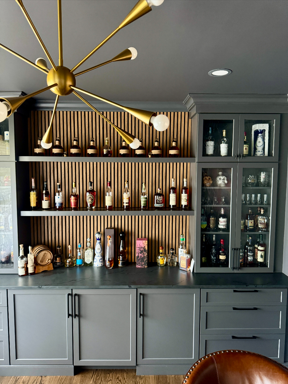 The client’s husband’s bourbon collection was growing rapidly and starting to take over the kitchen cabinets, leaving little room for anything else. The kitchen had become cluttered, and the collection, once a simple hobby, was beginning to overwhelm the space. The client wanted to find a way to showcase the collection without it encroaching on the rest of the home’s aesthetic, seeking a dedicated space where the bourbon could be enjoyed and displayed in a way that felt cohesive with the rest of their design.