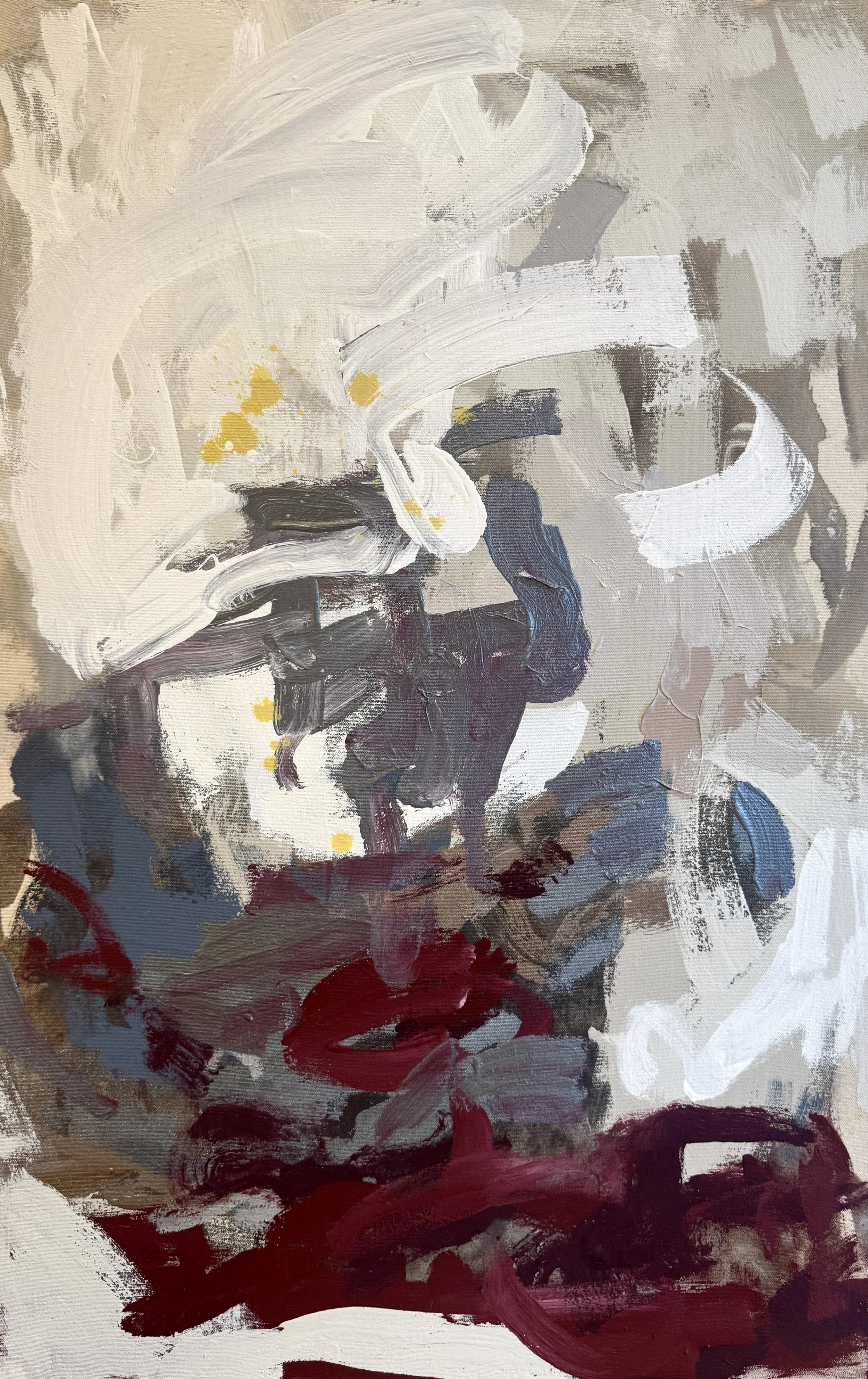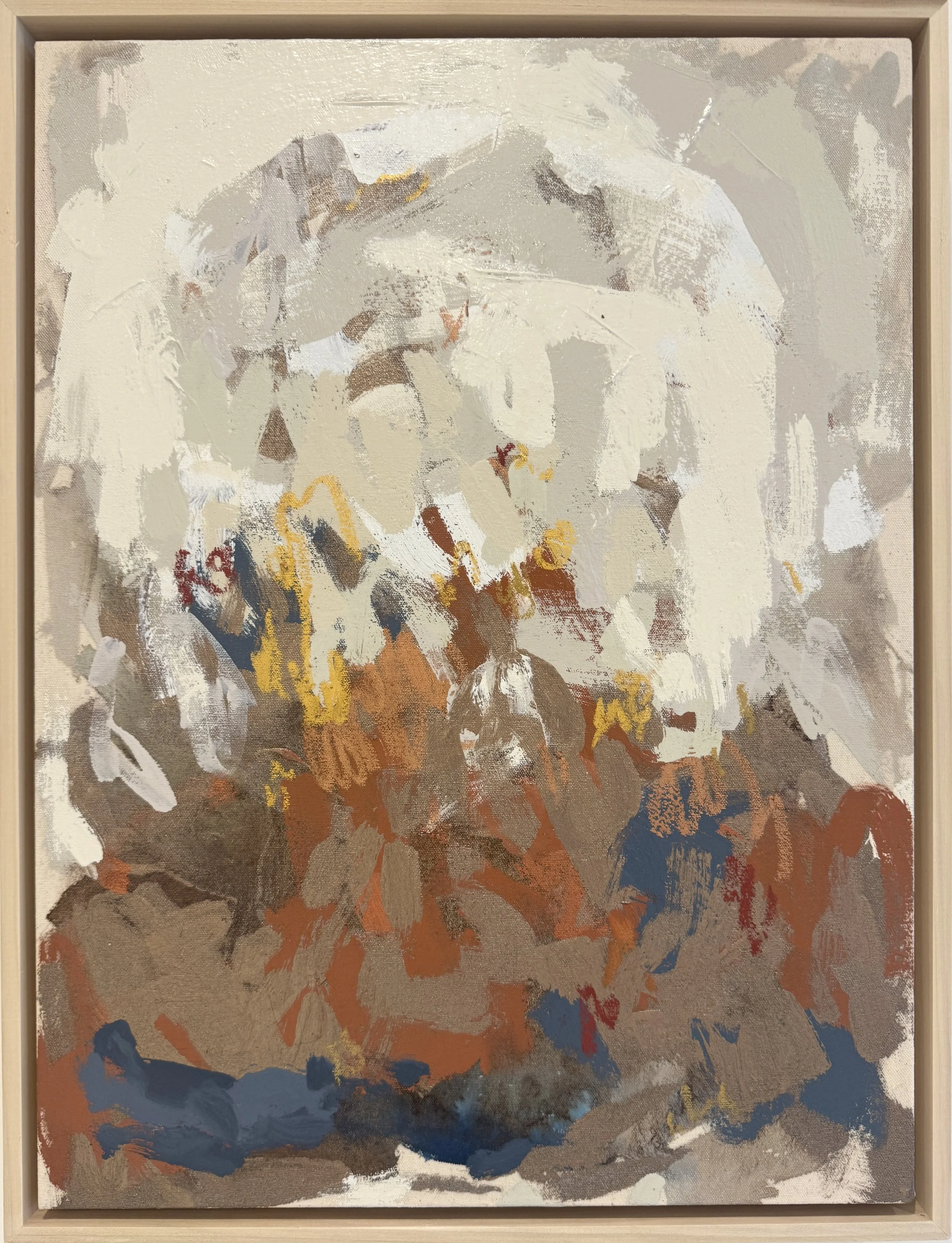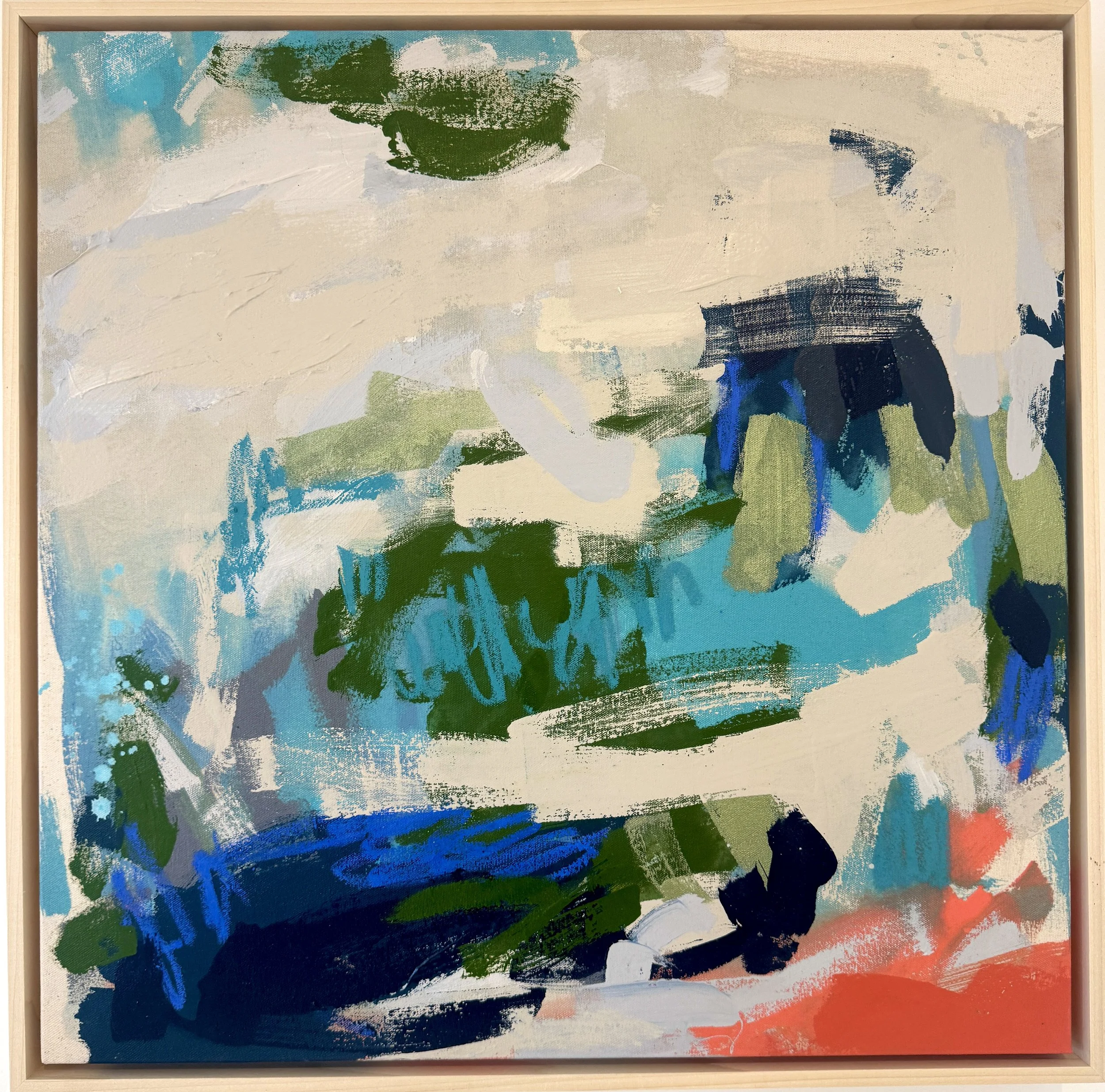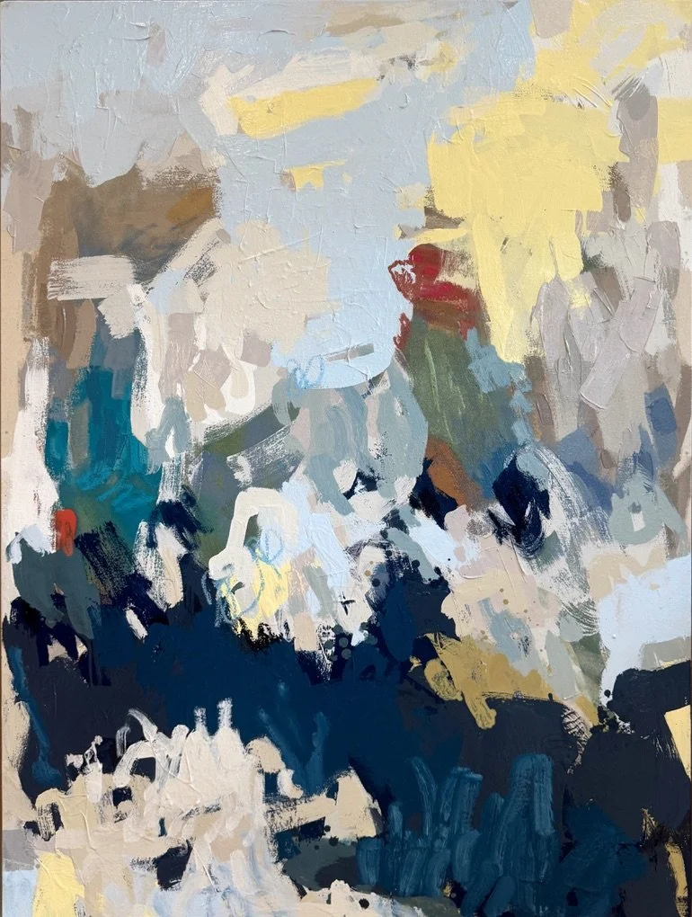 Erin’s paintings are unmistakable—soft yet bold, abstract yet grounded in feeling. She paints exclusively on raw, unprimed canvas, beginning each piece by pouring watered-down acrylics directly onto the fabric. Once the washes dry, she adds texture and structure using palette knives, oil pastels, and instinct.