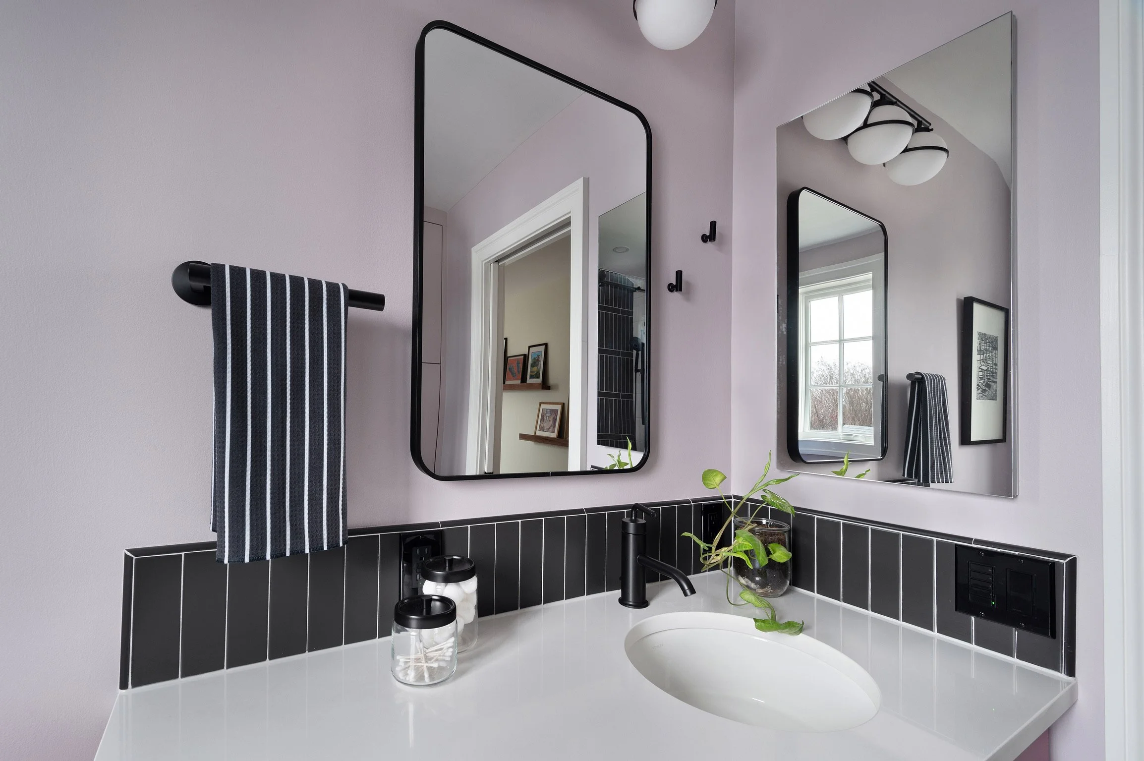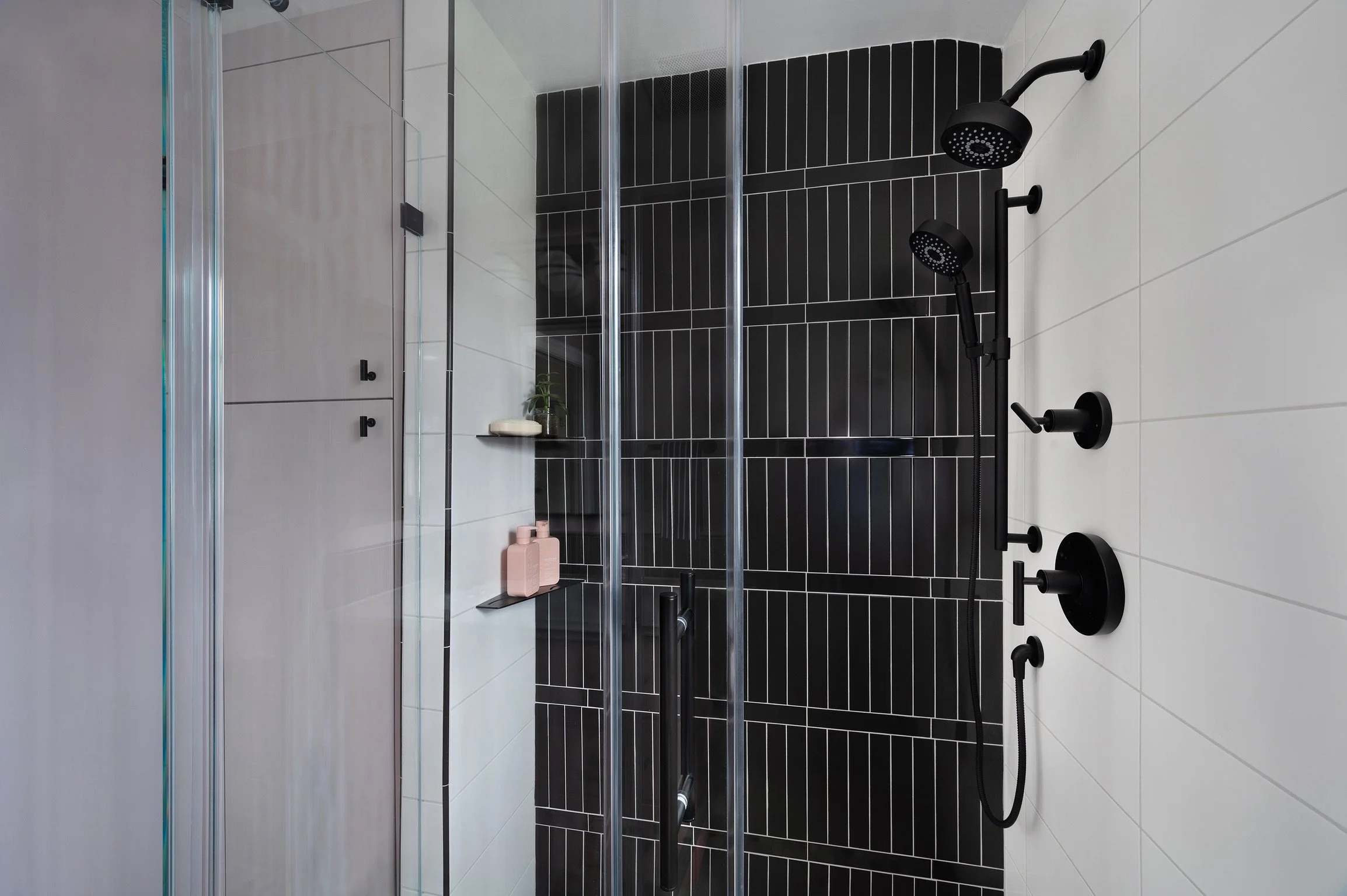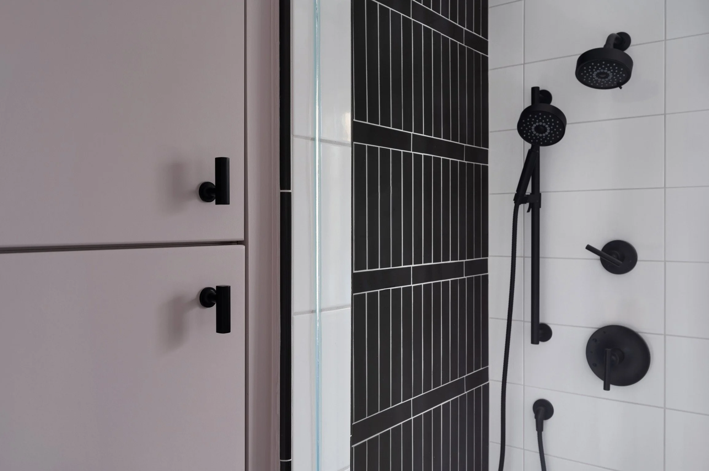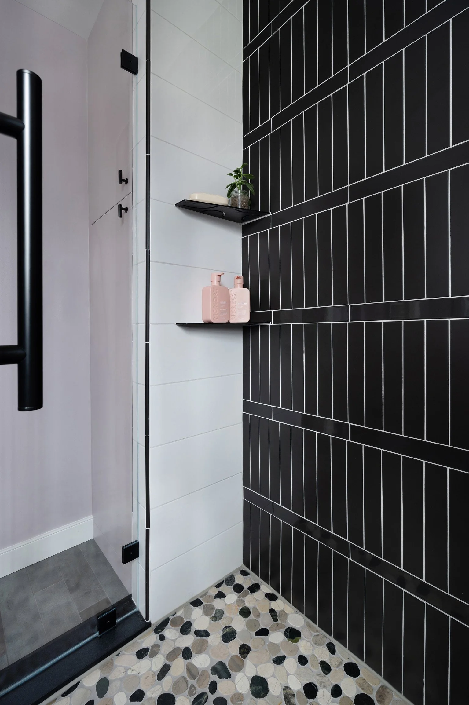We delivered on all fronts. A striking shower wall became the focal point, its design echoed in the sink’s backsplash for a sense of cohesion. A pebbled shower floor brought a natural, tactile contrast to the otherwise graphic elements of the room. The most unexpected twist came with the vanity-a last-minute decision to abandon the original wood finish in favor of a vivid fuchsia. When my client couldn’t quite picture the piece in stain, I suggested, “Let’s paint it!” The result was pure joy-both of us instantly fell in love with the color.